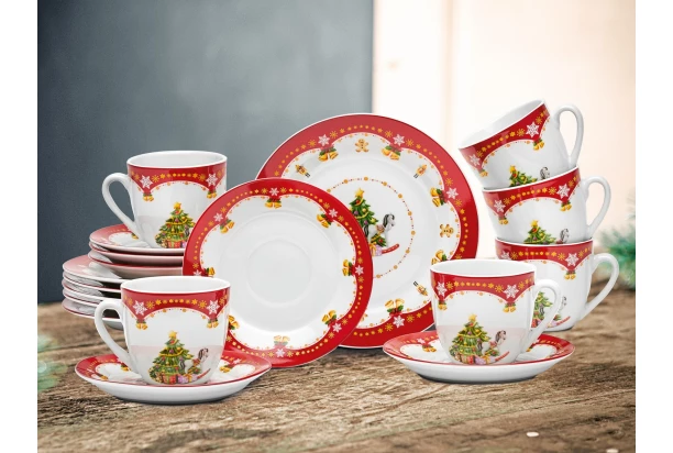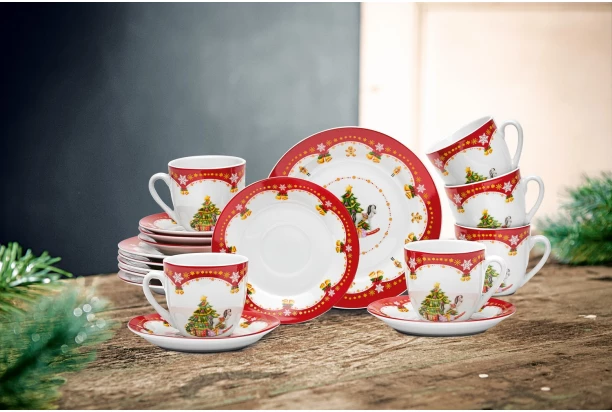 18-dielny kávový servis pre 6 osôb s vianočným motívom krásne doladí sviatočnú atmosféru. Taniere aj hrnčeky majú červené okraje, ktoré pripomínajú vianočnú girlandu. Riad je ozdobený aj vianočným stromčekom s darčekmi. S týmto servisom vnesiete do svojho domova to pravé kúzlo Vianoc.
