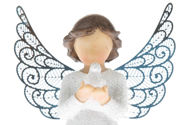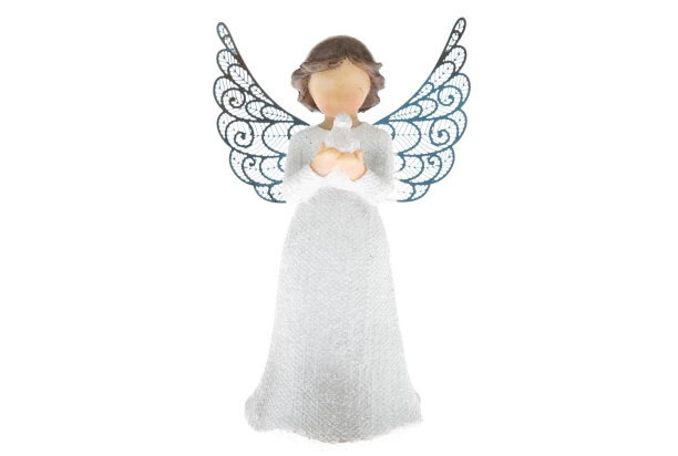 Dekoračná soška anjela je vyrobená z polyresinu, krídla sú však kovové, čo dodáva dekorácii elegantný vzhľad. Biely anjel drží vtáčika a dekorácia tak môže symbolizovať pokoj a mier.