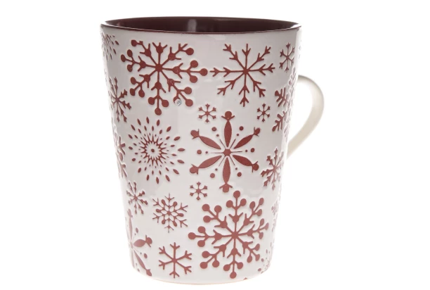 Hrnček s objemom 320 ml je ozdobený snehovými vločkami, a preto je ideálnym doplnkom pre Váš vianočný stôl. Hrnček je biely, ale motív a vnútro je červený, čo dodáva kontrast a zaujímavý dizajnový prvok. Vychutnajte si svoju obľúbenú kávu, čaj alebo napríklad horúce kakao a nalaďte sa na Vianoce.