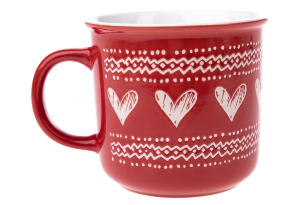 Keramický červený hrnček s bielymi srdiečkami s objemom 450 ml je ideálny na pitie teplých nápojov za chladných zimných večerov. Farebné prevedenie dodáva tomuto hrnčeku elegantný a tradičný vzhľad, ktorý môže doladiť vianočnú atmosféru.