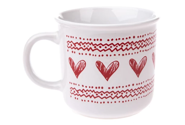 Keramický biely hrnček s červenými srdiečkami s objemom 450 ml je ideálny na pitie teplých nápojov za chladných zimných večerov. Farebné prevedenie dodáva tomuto hrnčeku elegantný a tradičný vzhľad, ktorý môže doladiť vianočnú atmosféru.