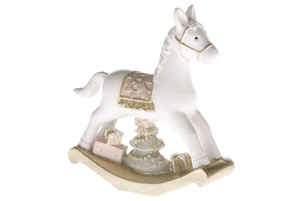 Vianočná dekoračná soška hojdací kôň s drobnými darčekmi, navodí sviatočnú atmosféru v každom interiéri. Či už ako dekorácia na stôl, na okenný parapet alebo ako doplnok k Vašej zbierke vianočných dekorácií, táto dekoratívna figúrka je skutočným pútačom pre oči. Nostalgická vianočná dekorácia je navrhnutá v klasickom retro štýle, ale farebná kombinácia pastelových farieb biela, ružová a zlatá dodáva hojdaciemu koňovi nadčasovú eleganciu.