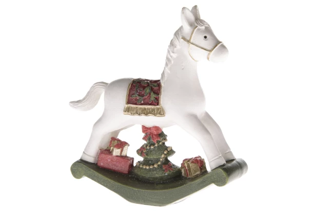 Vianočná dekoračná soška hojdací kôň s drobnými darčekmi navodí sviatočnú atmosféru v každom interiéri. Či už ako dekorácia na stôl, na okenný parapet alebo ako doplnok k Vašej zbierke vianočných dekorácií, táto dekoratívna figúrka je skutočným pútačom pre oči. Nostalgická vianočná dekorácia je navrhnutá v klasickom retro štýle, farebná kombinácia biela, zelená a červená dodáva hojdaciemu koňovi nadčasovú eleganciu.