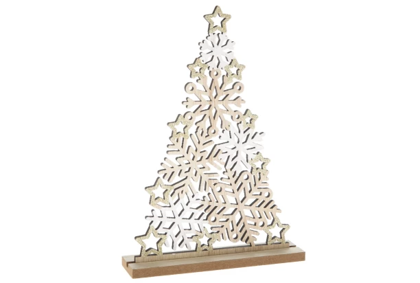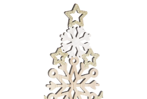 Vianočná dekorácia v tvare dreveného stromčeka zo snehových vločiek v bielej, zlatej a prírodnej farbe je krásnym a tradičným doplnkom vianočnej výzdoby. Táto dekoračná soška s výškou 30 cm prinesie do domova kúzlo Vianoc a útulnosť.