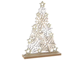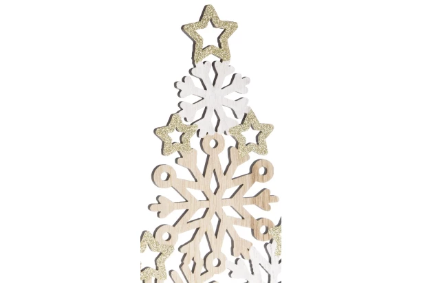 Vianočná dekorácia v tvare dreveného stromčeka zo snehových vločiek v bielej, zlatej a prírodnej farbe je krásnym a tradičným doplnkom vianočnej výzdoby. Táto dekoračná soška s výškou 24 cm prinesie do domova kúzlo Vianoc a útulnosť.