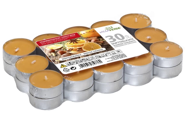 Balenie čajových sviečok s vôňou zimného pomaranča obsahuje 30 kusov, ktoré krásne prevoňajú Váš domov, a to hlavne počas Vianoc.