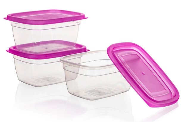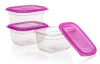 3-dielna sada plastových dóz s objemom 0,55 l s ružovým vekom. Dózy sú vhodné na skladovanie rôznych potravín.