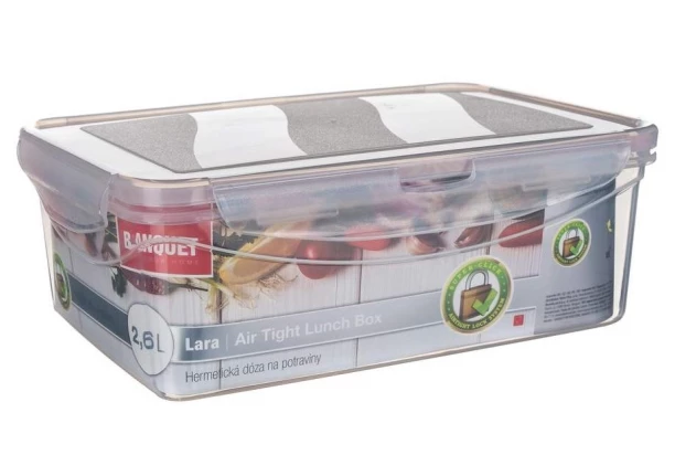 Hermetická plastová dóza s objemom 2,6 l s ružovým silikónovým tesnením. Potraviny zostávajú dlho čerstvé a bez zápachu.