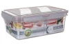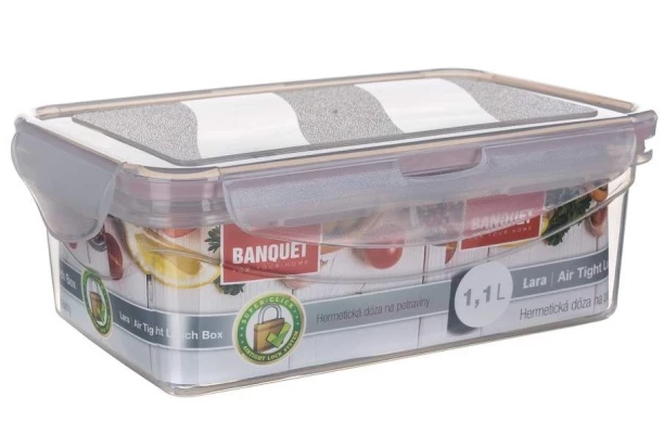Hermetická plastová dóza s objemom 1,1 l s ružovým silikónovým tesnením. Potraviny zostávajú dlho čerstvé a bez zápachu.