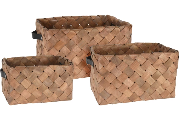 Táto sada obsahuje tri košíky v rôznych veľkostiach vyrobených z prepletaných drevených prúžkov v krásnej orechovej farbe. Košíky sú opatrené čiernymi úchytmi pre ľahké prenášanie. Tieto prútené koše sú vhodné na skladovanie rôznych predmetov a zároveň slúžia ako dekoratívny doplnok do domácnosti.