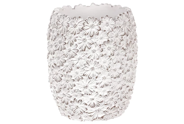Táto dekoratívna váza z betónu v bielej farbe je zdobená jemným dizajnom kvietkov, ktorý prináša do Vášho interiéru šarm a eleganciu. Váza je ideálna pre umiestnenie kvetín či rastlín a vďaka kompaktným rozmerom 14×17×14 cm ju ľahko umiestnite kamkoľvek, či už na stôl alebo policu.