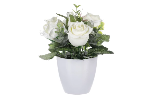 Elegantné umelé ružičky v krémovej farbe v kombinácii s plastovým obalom budú tvoriť nádhernú trvalú dekoráciu, ktorá oživí Váš domov. Kvetina vyzerá veľmi realisticky a vynikne na okennom parapete, stole alebo akomkoľvek inom viditeľnom mieste. Výška 20 cm.
