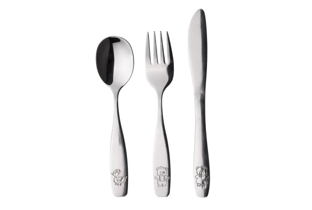 Detská 3-dielna sada príborov z kvalitnej nerezovej ocele. Detský príbor je doplnený motívom roztomilého zvieratka, ktoré prinesie radostné chvíle ku každému jedálenskému stolu s deťmi.