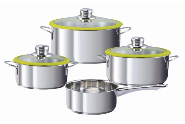 Sada hrncov Kiwi je vyrobená z prvotriednej nerezovej ocele a zaujme tradičným, jemne zaobleným dizajnom. Obsahuje tri hrnce so sklenenými pokrievkami s praktickým silikónovým lemom v zelenej farbe a jedna rajnica. Vďaka extra silnému termosendvičovému dnu je zaistená rovnomerná distribúcia tepla i jeho efektívna akumulácia. Riad je vhodný pre všetky typy varných dosiek, vrátane indukcie.