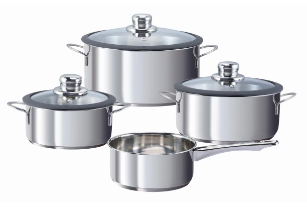 Súprava hrncov Grape je vyrobená z prvotriednej nerezovej ocele a zaujme tradičným, jemne zaobleným dizajnom. Obsahuje tri hrnce so sklenenými pokrievkami s praktickým silikónovým lemom v šedej farbe a jedna rajnica. Vďaka extra silnému termosendvičovému dnu je zaistená rovnomerná distribúcia tepla i jeho efektívna akumulácia. Riad je vhodný pre všetky typy varných dosiek, vrátane indukcie.