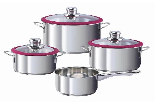 Sada hrncov Berry je vyrobená z prvotriednej nerezovej ocele a zaujme tradičným, jemne zaobleným dizajnom. Obsahuje tri hrnce so sklenenými pokrievkami s praktickým silikónovým lemom vo vínovej farbe a jedna rajnica. Vďaka extra silnému termosendvičovému dnu je zaistená rovnomerná distribúcia tepla i jeho efektívna akumulácia. Riad je vhodný pre všetky typy varných dosiek, vrátane indukcie.