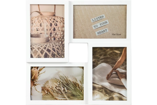 Rámček na 4 fotografie, vyrobený z bieleho plastu, predstavuje elegantné spojenie praktickosti a štýlu. Jeho dizajn umožňuje usporiadať fotografie vo formátoch 10×15 cm, čo z neho robí skvelý doplnok pre váš interiér. S možnosťou jednoduchého zavesenia na stenu sa stáva výraznou dekoráciou pre každý priestor. Celkové rozmery rámu sú 27,5×27,5×2 cm, čo poskytuje dostatok priestoru pre vaše obľúbené snímky.