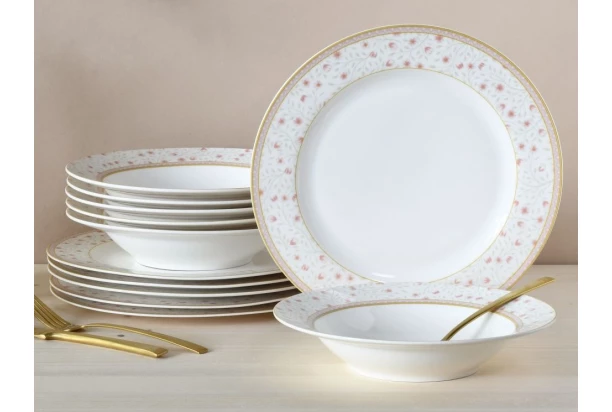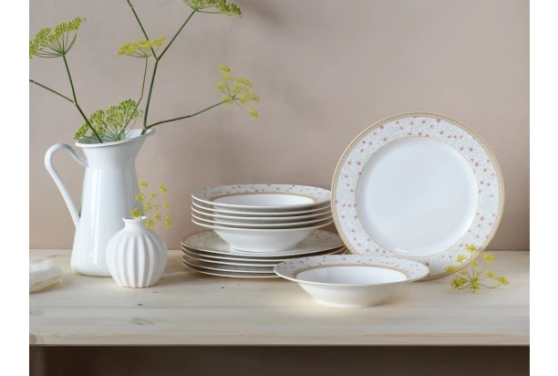 12-dielny jedálenský servis na každodenné použitie i slávnostné príležitosti. Jemný kvetinový dekor na krémovo bielom podklade dodáva celej jedálenskej sade nezameniteľný romantický šarm, ideálny na vytvorenie dokonalej atmosféry na stolovanie.