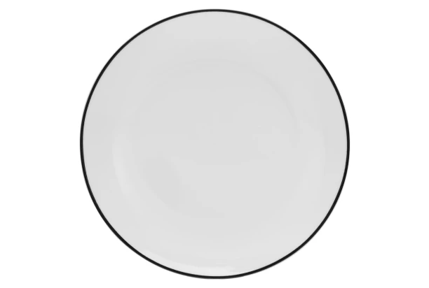 Jedálenský tanier s priemerom 27 cm je vyrobený z kvalitného porcelánu v bielej farbe, ktorá prináša do Vašej jedálne čistotu a sviežosť. Na vonkajšom okraji je jemne spracovaná, ručne maľovaná čierna linka, ktorá dodáva tanieru nadčasovú eleganciu.