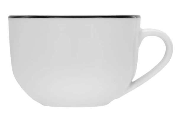 Šálka s objemom 200 ml je vyrobená z kvalitného porcelánu v bielej farbe, ktorá prináša do Vašej jedálne čistotu a sviežosť. Na vonkajšom okraji je jemne spracovaná, ručne maľovaná čierna linka, ktorá dodáva hrnčeku nadčasovú eleganciu. Vhodná na kávu a čaj.