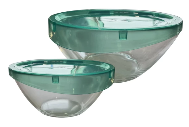 Sada obsahuje 2 sklenené misy s plastovým vekom v modrozelenej farbe, ktoré sú určené na uchovávanie a servírovanie šalátov a iných pokrmov.