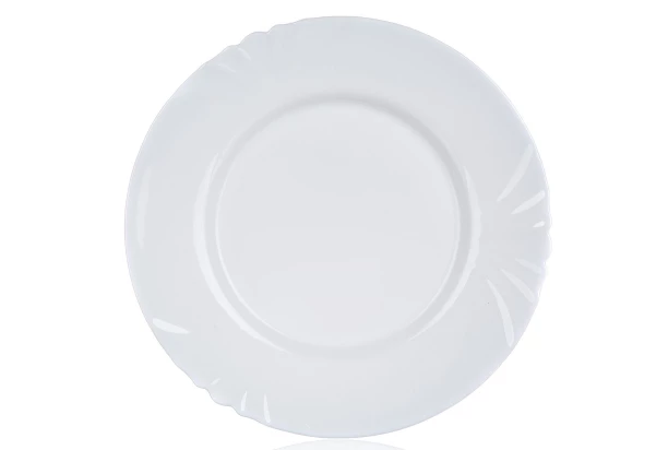 Plytký tanier s priemerom 25 cm je vyrobený z tvrdeného skla s vysokou odolnosťou. Jedálenský tanier je ideálny na servírovanie rôznych pokrmov. Univerzálna biela farba, elegantný zvlnený okraj.