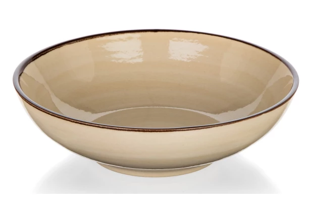 Elegantný hlboký tanier v krémovej farbe s tmavo hnedým lemom sa hodí do každého prírodne ladeného interiéru. S priemerom 18 cm je ideálny na podávanie polievky, šalátu, cestovín, či ovocia a zeleniny. Polievkový tanier je vyrobený z odolnej keramiky a je vhodný na každodenné použitie.