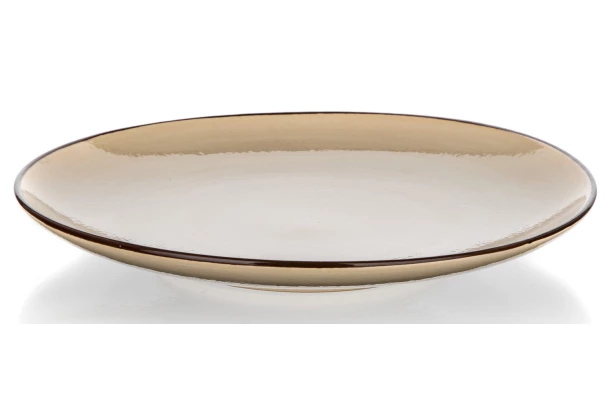 Elegantný plytký tanier v krémovej farbe s tmavo hnedým lemom sa hodí do každého prírodne ladeného interiéru. S priemerom 27 cm je ideálny na podávanie rôznych pokrmov. Jedálenský tanier je vyrobený z odolnej keramiky a je vhodný na každodenné použitie.