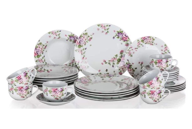 30-dielna jedálenská sada sa hodí pre každé stolovanie. Elegantný porcelánový riad s kvetinovým dekorom je vhodný na akúkoľvek príležitosť, či už je to formálna večera alebo neformálne stretnutie s priateľmi a rodinou. S týmto jedálenským servisom vytvoríte krásne prestretý stôl pre vašich hostí.
