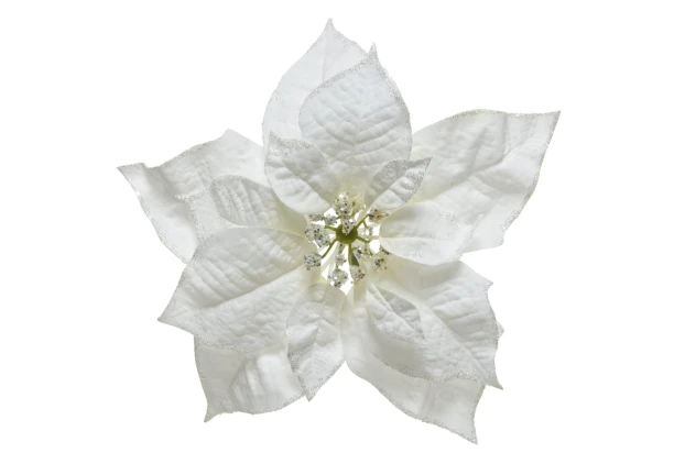 Elegantný umelý kvet vianočnej hviezdy v bielej farbe perfektne doladí sviatočnú atmosféru a krásne vynikne na vianočnom stromčeku. Dekoráciu je možné vďaka praktickému klipu ľahko pripnúť na akékoľvek miesto. Veľkosť 24 cm.