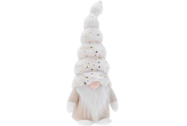 Roztomilý vianočný trpaslík v krémovo-bielej farbe má mäkké plyšové telo, vysokú čiapku v tvare špičky a dlhú plnovous. Škriatok s výškou 32 cm dodá vášmu domovu sviatočnú atmosféru a vnesie do priestoru to pravé kúzlo Vianoc. Výška 32 cm.