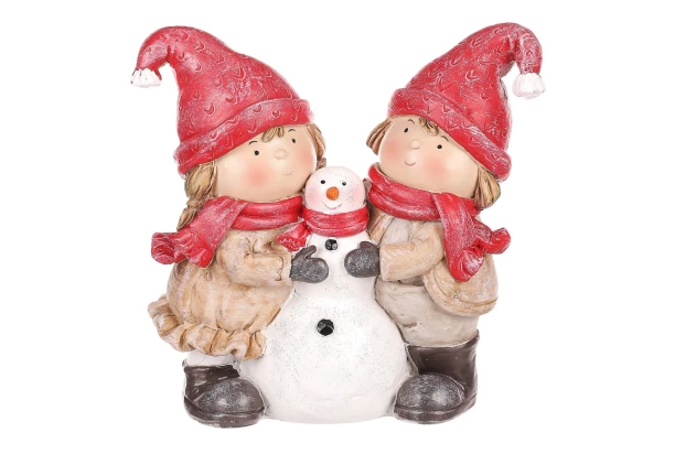 Dekoratívna figúrka zobrazuje dve deti v červených zimných čiapkach a šálach, stojace po stranách malého snehuliaka. Vďaka farebnému zladeniu sa perfektne hodia na vianočnú výzdobu a sú ideálnou dekoráciou na poličku, stôl, komodu, okenný parapet a ďalšie viditeľné miesta. S ich roztomilými tváričkami prinesú do vášho interiéru kúzlo detskej radosti a anjelskej nevinnosti.