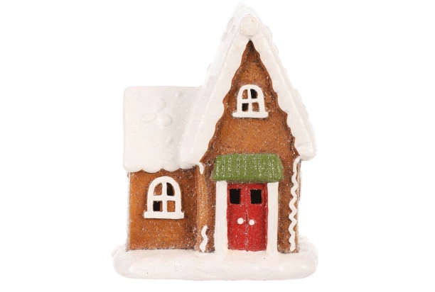 Sviatočná dekorácia z hnedej keramiky dokonale pripomína skutočný perníkový domček vďaka detailnému zdobeniu a vierohodnému vzhľadu. Má biele okienka a ďalšie ozdobné prvky, okrem dvierok, ktoré sú červené a zelené striešky nad nimi. Samotný domček so zasneženou strechou stojacou na bielom podklade, len podtrhuje krásu zimného obdobia. LED osvetlenie napájané dvoma batériami LR44 navodí útulnú sviatočnú atmosféru počas zimných večerov.
