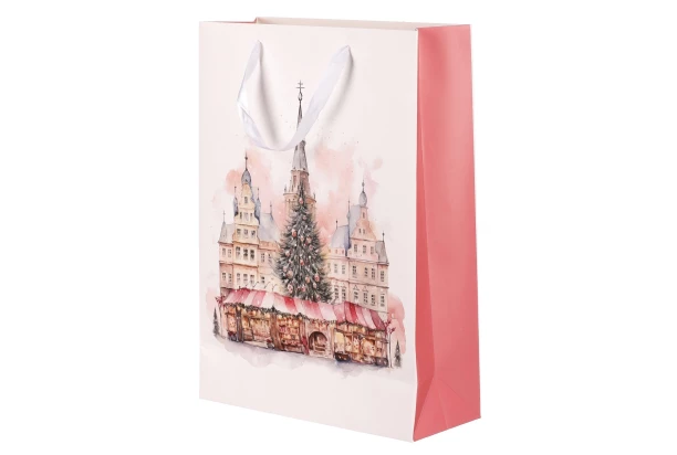 Vianočná papierová taška vo veľkosti L s motívom vianočného trhu je praktickým a elegantným riešením, ako ľahko a rýchlo zabaliť darčeky. Sviatočný vzor dodáva vášmu daru jedinečný vzhľad, ktorý určite poteší vašich blízkych.