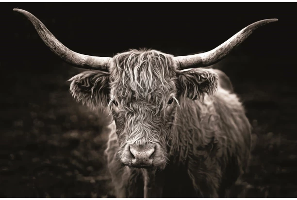 Obraz tlačený na plátne o rozmere 118×78 cm sa stane dominantným prvkom akéhokoľvek interiéru. Motív škótskej horskej kravy s dlhou, huňatou srsťou a silnými rohmi v monochromatických farbách vnesie do vášho domova pokoj a majestátnu silu prírody.