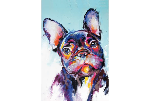 Obraz tlačený na plátne o rozmere 60×90 cm oživí každú stenu a vnesie do vášho domova hravosť a moderný umelecký nádych. Pestrofarebný portrét francúzskeho buldočka s efektom ručnej maľby dodá priestoru pop-artový charakter.