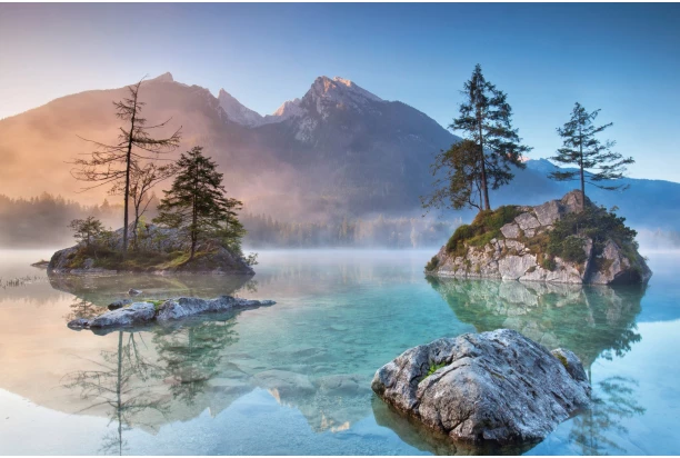 Obraz tlačený na plátne o rozmere 90×60 cm s motívom horskej krajiny vnesie do interiéru atmosféru pokoja a harmónie. Tento obraz zachytáva pohľad na bavorské jazero Hintersee v ranných lúčoch.