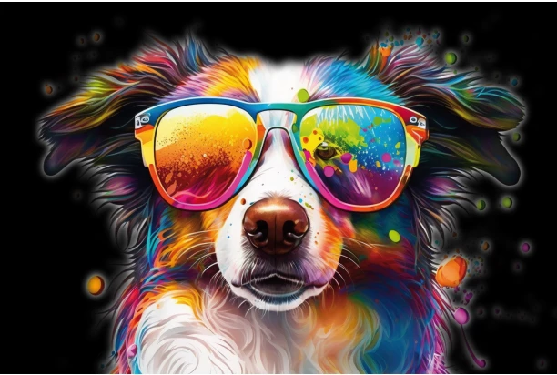 - motív: abstrakcia, zviera pes so slnečnými okuliarmi