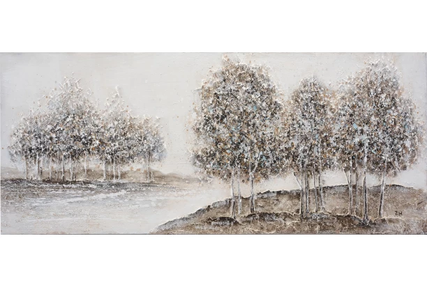 Ručne maľovaný obraz olejom s motívom zimnej krajiny so stromami zaujme svojou krásou, bohatými detailmi, plastickosťou a originalitou. Každý obraz je jedinečný vďaka ručnému spracovaniu umelca, ktorý prejavuje svoju kreativitu a citlivosť vo všetkých krokoch maľovania. Olejomaľba o rozmere 140×60 cm sa môže stať centrálnym bodom miestnosti nad gaučom, dokáže navodiť útulné prostredie v spálni, na stene v jedálni alebo na chodbe vie pritiahnuť pozornosť návštev a vytvoriť príjemnú atmosféru. Nástenná dekorácia sa ľahko prispôsobí rôznym štýlom bývania, kde bude vyzerať skutočne pôsobivo.