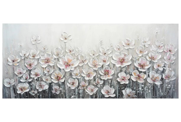 Ručne maľovaný obraz olejom s motívom rozkvitnutých bielych kvetov zaujme svojou krásou, bohatými detailmi, plastickosťou a originalitou. Každý obraz je jedinečný vďaka ručnému spracovaniu umelca, ktorý prejavuje svoju kreativitu a citlivosť vo všetkých krokoch maľovania. Olejomaľba o rozmere 140×60 cm sa môže stať centrálnym bodom miestnosti nad gaučom, dokáže navodiť útulné prostredie v spálni, na stene v jedálni alebo na chodbe vie pritiahnuť pozornosť návštev a vytvoriť príjemnú atmosféru. Nástenná dekorácia sa ľahko prispôsobí rôznym štýlom bývania, kde bude vyzerať skutočne pôsobivo.