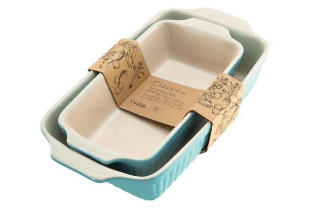 Sada obsahuje 2 štýlové zapekacie misky z kvalitnej kameniny, ktoré sú ideálne na prípravu i servírovanie pokrmov. Tieto hranaté misy sú vhodné do rúry až do 250°C a je možné ich bez obáv použiť aj v mikrovlnnej rúre. Misky sú opatrené jemným reliéfom a praktickými úchytmi pre ľahkú manipuláciu. Vďaka svojmu nadčasovému dizajnu v modro-krémovom prevedení skvele doplní akýkoľvek interiér kuchyne a hodí sa pre rôzne typy pokrmov – od zapekaných zemiakov až po dezerty.