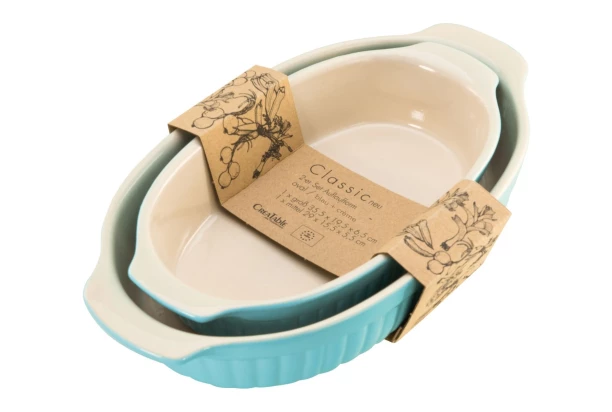 Sada obsahuje 2 štýlové zapekacie misky z kvalitnej kameniny, ktoré sú ideálne na prípravu i servírovanie pokrmov. Tieto oválne misy sú vhodné do rúry až do 250 ° C a je možné ich bez obáv použiť aj v mikrovlnnej rúre. Misky sú opatrené jemným reliéfom a praktickými úchytmi pre ľahkú manipuláciu. Vďaka svojmu nadčasovému dizajnu v modro-krémovom prevedení skvele doplnia akýkoľvek interiér kuchyne a hodia sa pre rôzne typy pokrmov – od zapekaných zemiakov až po dezerty.