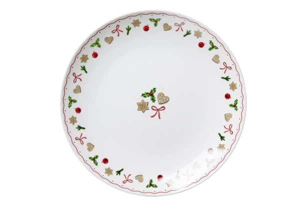 Tento elegantný a sviatočne ladený tanier je ideálny na Vianočné pečivo. Je vyrobený z kvalitného porcelánu a zdobia ho nádherné Vianočné motívy, ako sú perníčky, mašle, ozdoby a ďalšie symboly Vianoc. Priemer 23,5 cm.