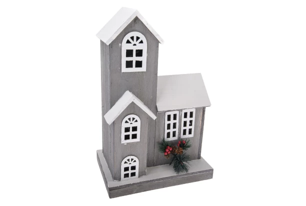 Elegantný drevený domček s LED osvetlením vytvorí v každom interiéri útulnú vianočnú atmosféru. Domček v šedo-bielej farbe sa hodí do rôznych štýlov vianočnej výzdoby.