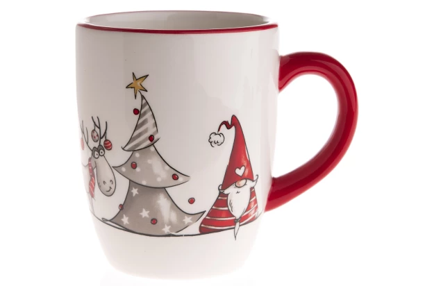 Tento roztomilý keramický hrnček s objemom 350 ml je ideálnym spoločníkom pre všetkých milovníkov Vianoc. Detailne spracovaný motív roztomilého soba, ozdobeného vianočného stromčeka a veselého trpaslíka v červenej čiapke dodá vášmu vianočnému stolu kúzelnú atmosféru. Vysoko kvalitná keramika a pohodlné červené ucho zaisťujú príjemné používanie. Perfektný pre horúcu čokoládu, čaj alebo kávu. Môže byť tiež skvelým darčekom pre všetkých milovníkov Vianoc.