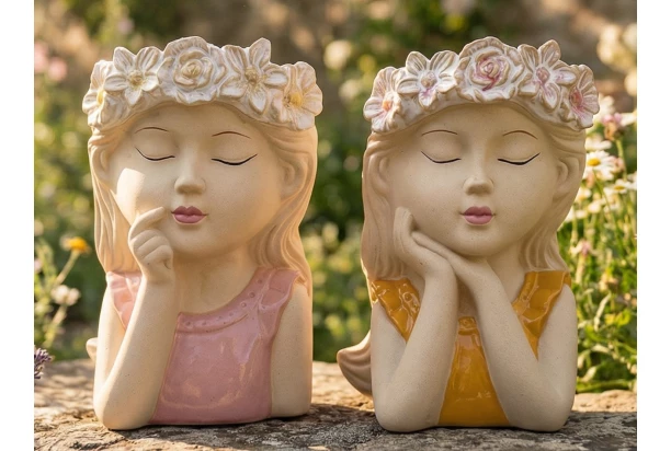 Dekoratívny kvetináč dodávaný v 2 rôznych dizajnoch snívajúceho dievčaťa s kvetinovou čelenkou vnesie do vášho domova alebo záhrady nádych nehy a pokoja. Kameninový obal na kvety okamžite upúta pozornosť a stane sa nielen praktickým doplnkom, ale aj štýlovou dekoráciou.