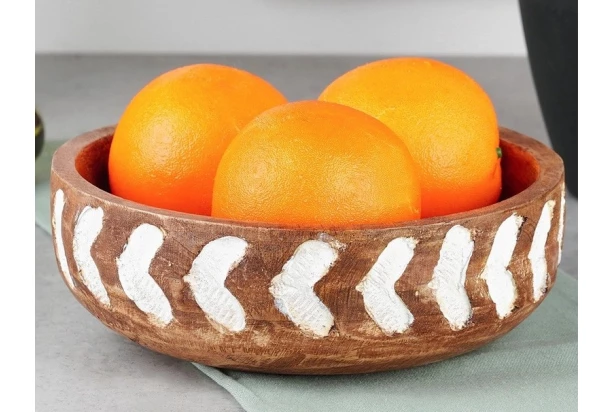 Štýlová misa z mangového dreva s ručne vyrezávaným bielym vzorom je ideálna na servírovanie sušených plodov a ovocia, zároveň je aj peknou dekoráciou. Priemer 20 cm.