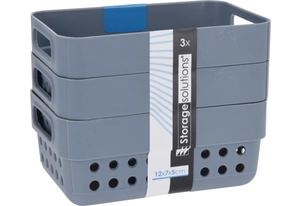 Súprava obsahuje 3 úložné košíky s objemom 350 ml, dostupné v rôznych farbách. Štýlový a praktický doplnok do domácnosti, ideálny na ukladanie drobností a udržanie poriadku.