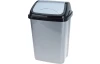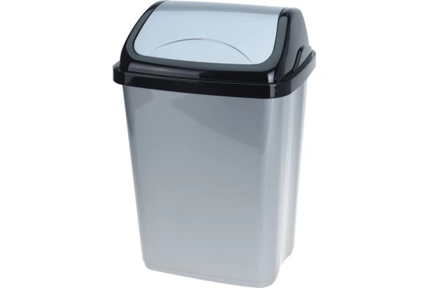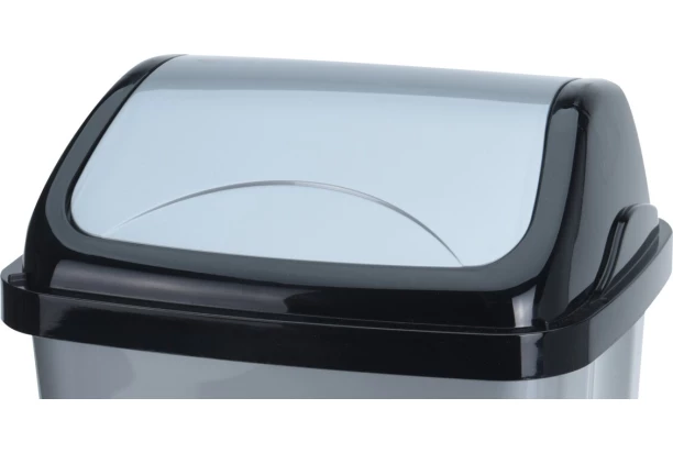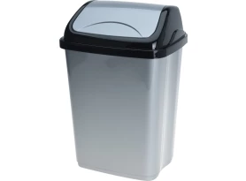 Praktický odpadkový kôš s výklopným otočným vekom má objem 10 litrov a je navrhnutý v odtieňoch čiernej a metalickej šedej. Univerzálne využitie v každej miestnosti, kde je potrebná likvidácia odpadkov.