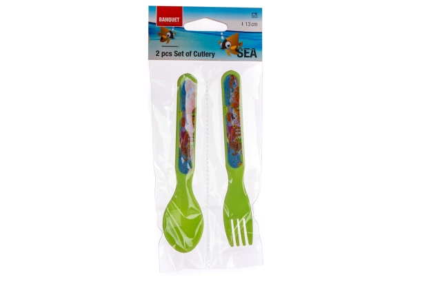 2-dielna sada obsahuje detskú vidličku a lyžicu v zelenej farbe s hravým podmorským motívom, ktorá prinesie radosť pri každom jedle. Vďaka kvalitnému plastu je detský príbor ľahký, ľahko umývateľný a praktický na každodenné použitie. Dĺžka 13 cm.